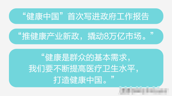 据新华社报道:中国将成为全球健康产业的最大市场。而且“健康中国”战略明确指出:到2030年,健康服务业总规模将达到16万亿。现阶段的市场规模据这个发展目标尚存在十几万亿的发展空间,这也就意味着大健康产业将迎来黄金时期!
